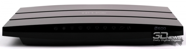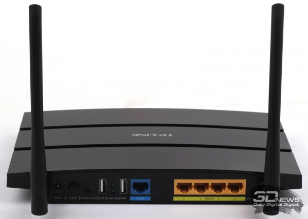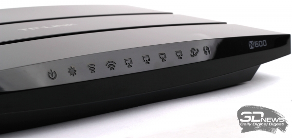 Индикаторы указывают на наличие питания, состояние системы, активность обоих беспроводных модулей, передачу данных по WAN- и LAN-портам, а также на работу WPS. На задней панели, около двух USB-портов версии 2.0, есть ещё парочка индикаторов, которые показывают наличие подключённых к ним устройств.