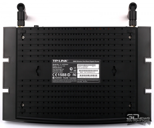 Днище усеяно мелкими вентиляционными отверстиями. В углах находится четвёрка маленьких резиновых ножек, в центре расположилась информационная наклейка, а по бокам от неё есть пара отверстий для крепления роутера к стене.