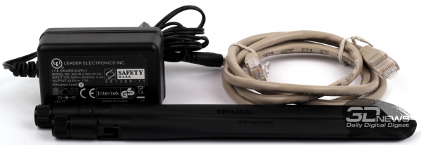 В комплекте с роутером поставляются две съёмные всенаправленные антенны, компактный блок питания мощностью 18 Вт, коротенький патч-корд, диск с ПО, гарантийный талон, пара инструкций и рекламные буклетики.